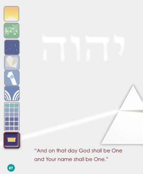 As creative designer, I wanted this children’s siddur to be more than a collection of words and pictures. I wanted the design to provoke thought and stimulate discussion. My goal was to devise a prayerbook for younger students that would be engaging and educational without relying on textual commentary. Images and layout, instead of explanations, would have to illustrate the structure of the prayerbook and the significant themes of the prayers. Yet many ideas found in the Siddur are difficult to illustrate; how does one draw a picture of ‘God is One’? For each prayer, we asked: how can we design this page to communicate the main idea of this text?