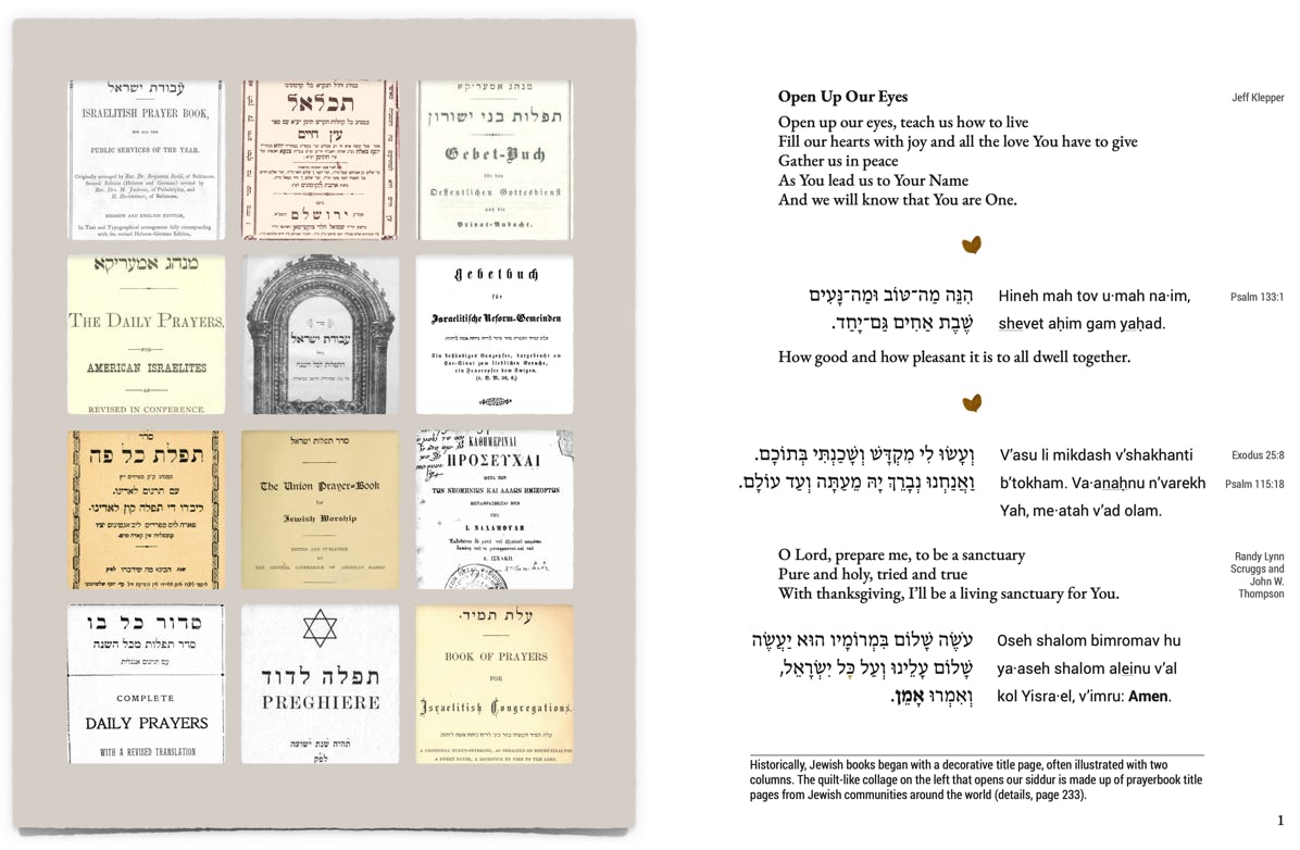 Designing the right opening spread (pg. 1!) of the prayerbook was very important. After much thought and effort, we decided to create a collage of opening pages from many liberal and historical siddurim. We thought this quilt-like image was appropriate and perfect: many manuscripts begin with a page called the “carpet” page. And a quilt is a fitting metaphor for the siddur. Quilts are made by cutting and pasting scraps of fabric (often family heirlooms) and passed on from generation to generation. The 12 boxes may also remind viewers of a stained glass window, and the use of 12 images was chosen deliberately to recall the ḥoshen of the High Priest (often represented on Torah shields or mantles). On the next page, are the poems, “Praying” by Mary Oliver: “It doesn’t have to be // the blue iris ….” and “You Reading This, Be Ready” by William Stafford, which help the reader get into the right frame of mind when entering prayer.