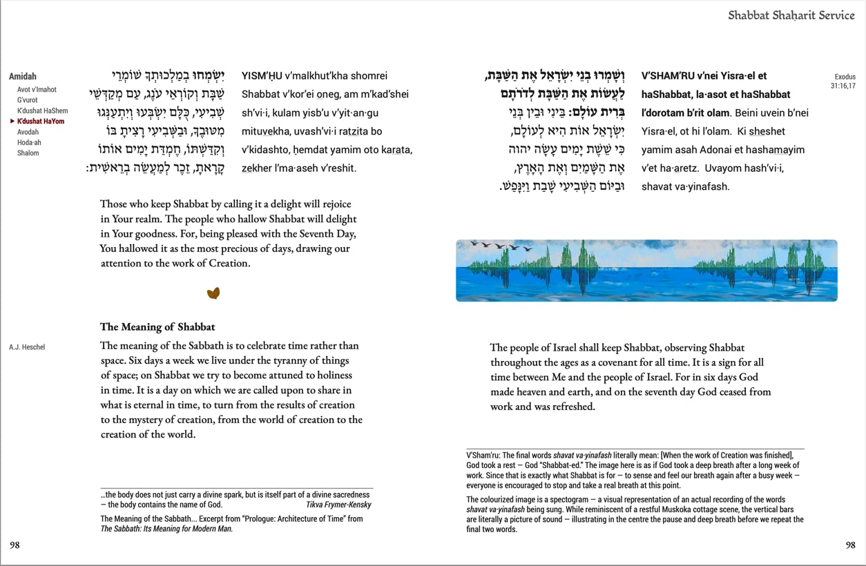 The restful lake image actually contains a spectogram — a visual representation of an actual recording of the words shavat va·yinafash being sung. While reminiscent of a restful Muskoka cottage scene, the vertical bars are literally a picture of sound — illustrating in the centre the pause and deep breath before we repeat the final two words.