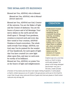A sample spread from the Senior edition of The Leo Baeck Siddur is shown below. Each page is framed with an accessible commentary to enhance the meaning of the prayers. The design of the page recalls the format of a page of Talmud, with the central text in the center, and the commentary along the edges.